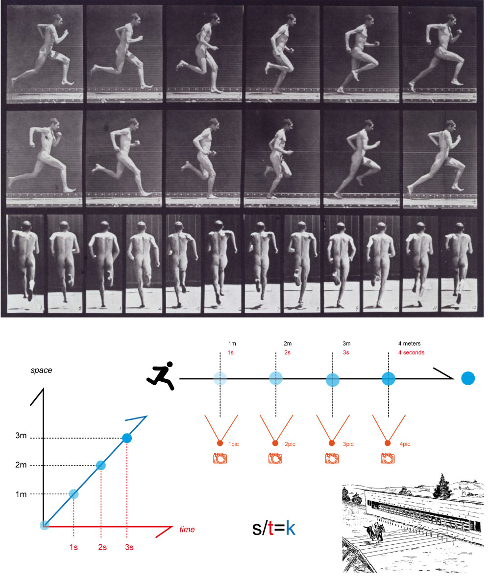 Generalmente assimilata nella loro relazione (velocità), in questo processo la corsa viene rappresentata in inquadrature discrete in cui spazio e tempo procedono in maniera uniforme costante (k), per poi essere ricomposte in sequenze continue, che simulano il reale svolgersi dell’evento .