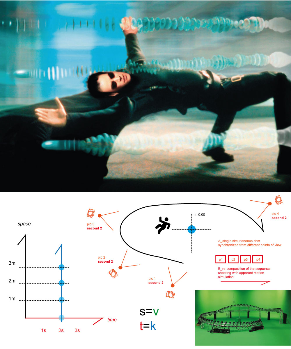 BULLET TIME_The inverse of the parametric manipulation of the photofinish is realized in the memorable scene of the Matrix, where the falling body of Neo remains suspended in the void, while the camera moves credibly, shooting it at 360 degrees.