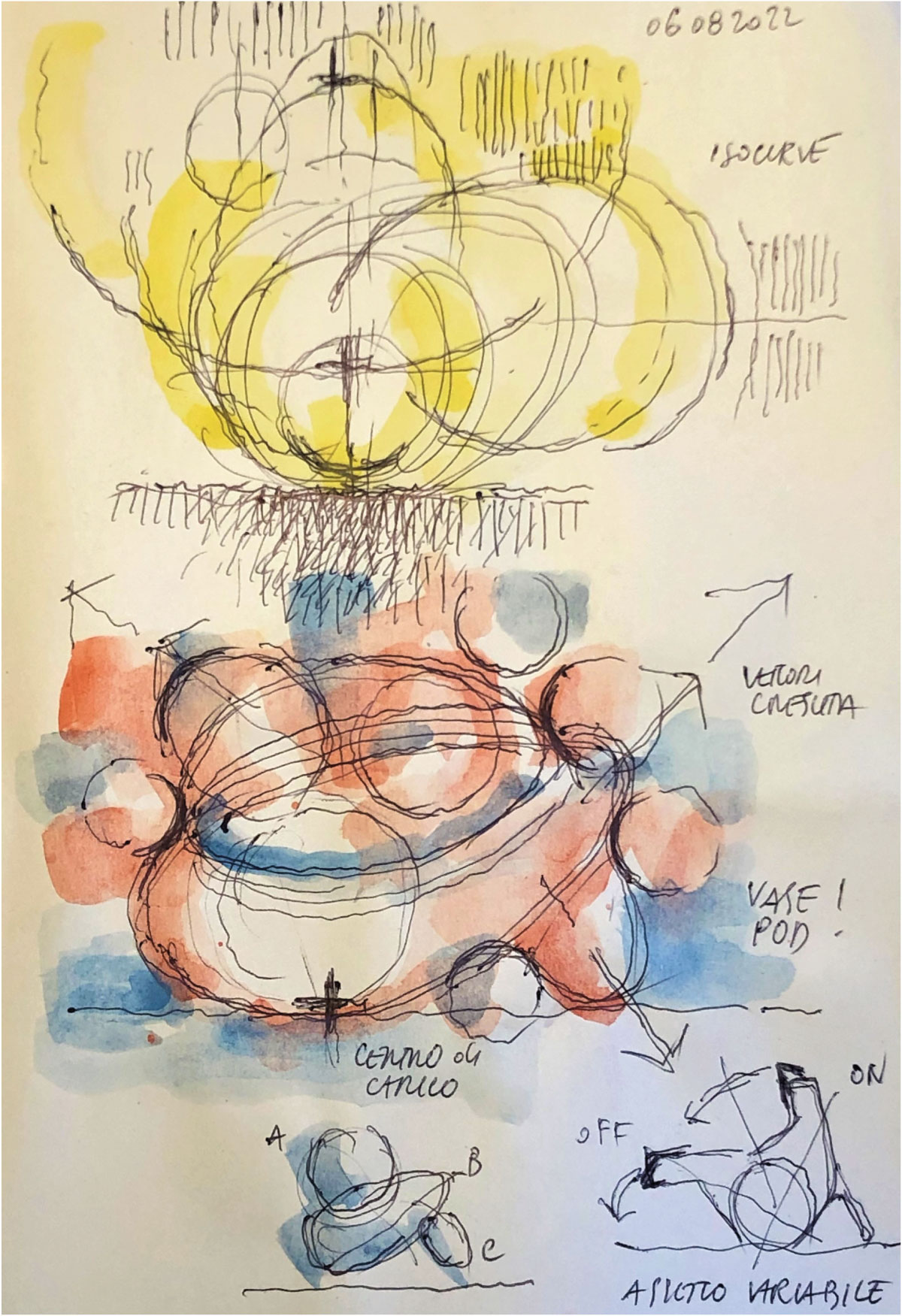The investigation will be conducted through drawing and modeling in traditional plasticine, for the definition of volumes and components, integrating them with digital painting with a capacitive pen, for the production of mesh deformation maps from virtual gouaches.
