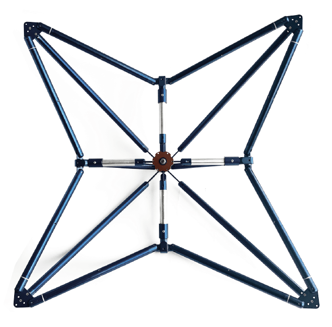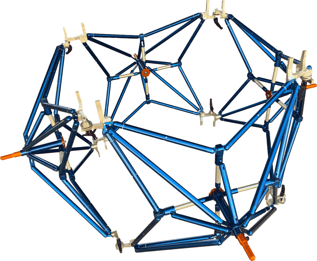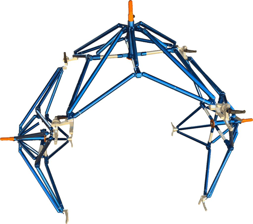 Una volta aperti, i moduli possono essere collegati tra loro tramite diverse tipologie di giunti, che consentono di regolare rapidamente lo sviluppo geometrico planare e/o volumetrico della configurazione voluta.
