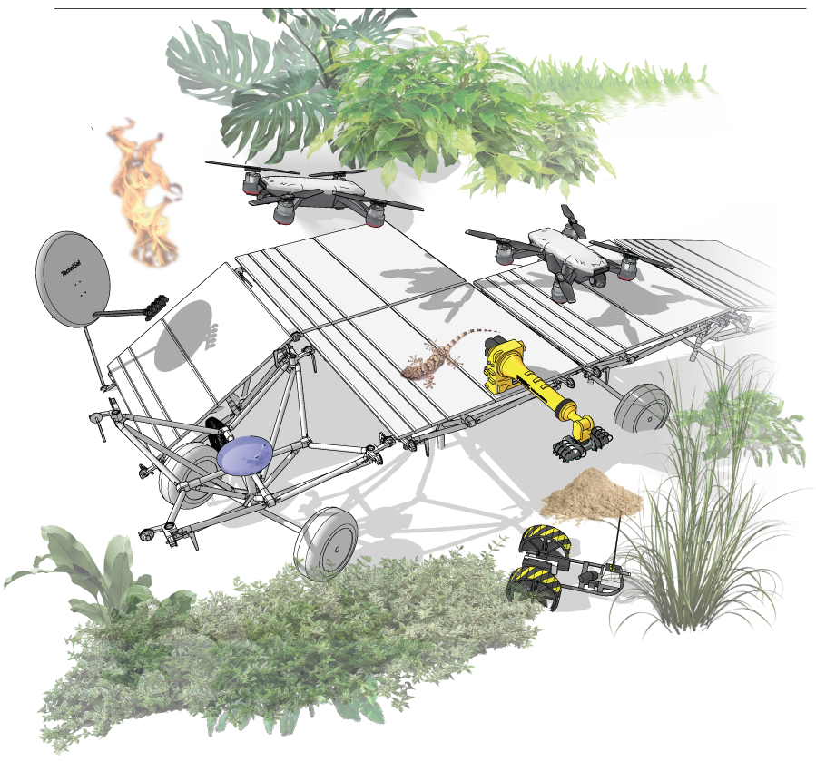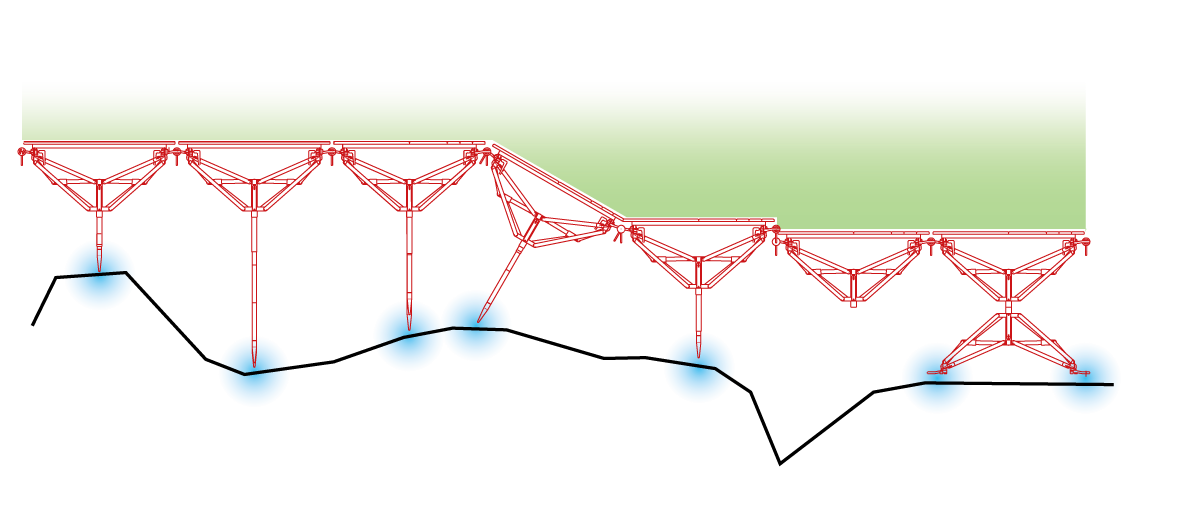 In its infinite configuration, it is able to quickly compose suspended floors and walls on any type of terrain, touching it in very few points.