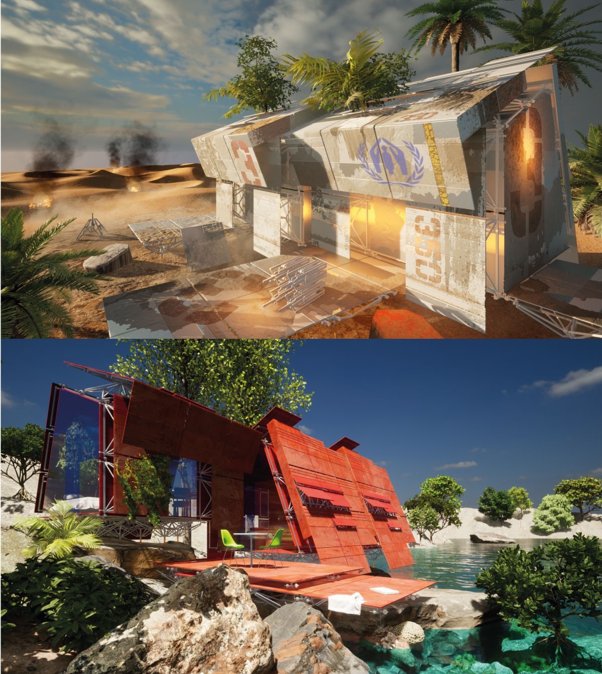 MU realizza moli e strutture flottanti, rifugi in zone di crisi ambientale e umanitarie, spazi di accoglienza in aree di riserva naturale, che possono essere modificati e adattati nel tempo ed essere facilmente spostati e rimossi.